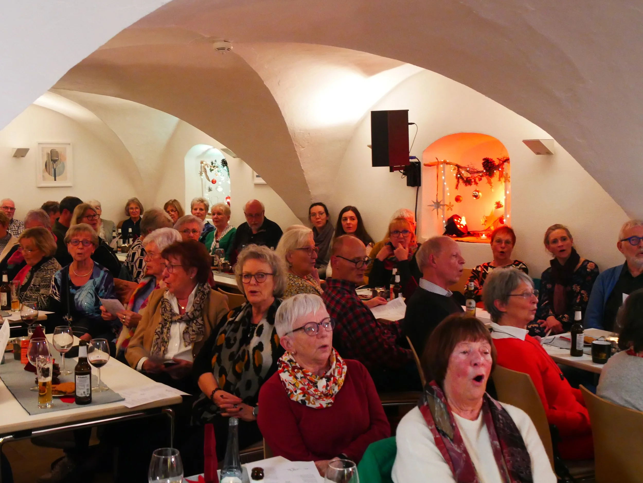 Das Team des Fördervereins hat auch in diesem Jahr wieder alles unternommen, um eine perfekte Wohlfühlatmosphäre zu schaffen- das Geschenkpapier raschelt, der Spekulatius duftet und der Geruch nach frischem Tannengrün zieht durch den Raum. Der Abend mit „Jazztogether und Freunden“ ist ein Mix aus Rudelsingen, Gemütlichkeit, Comedyund Rätselspaß. Den musikalischen Fokus richtete Hubert Schmalor in diesem Jahr auf Adventslieder wie „Tochter Zion“, „Maria durch ein Dornwald ging“ und „Es kommt ein Schiff geladen“ und das Publikum sang die bekannten Weisen gerne mit. Beide Veranstaltungen (2. und 9. Dezember) waren schnell restlos ausverkauft und wieder einmal hat sich gezeigt, das diese Kultveranstaltung - mit Liebe, Herzblut und Engagement vom Förderverein vorbereitet - quasi zu einem großen Familientreffen geworden ist, das in 2026 einer weiteren Auflage entgegensieht.Foto: C. Reichhart