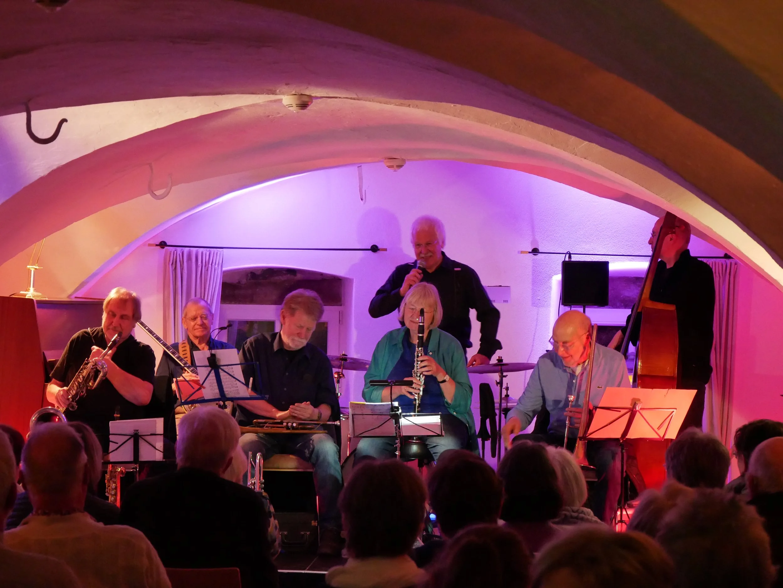 Knapp zwei unterhaltsame Stunden lagen vor den Besuchern und die Zeit wurde von den Musikern gekonnt mit Swing, Dixie und Blues gefüllt. Die Jazzer nahmen das Publikum mit auf die musikalische Reise. So entführten die Musiker ihre Zuhörer jazztechnisch auf die Insel Capri oder zum Scheich von Arabien. Mit einem Schlagzeugsolo ging die Band in die Pause, um anschließend mit Kontrabass, Klarinetten, Banjo, Saxophon und Gesang durchzustarten. So begannen ganz ruhig die Klarinetten mit einem Thema, nach und nach kamen die weiteren Instrumente hinzu, bis sich ein volles harmonisches Jazzstück entwickelte. Das fachkundige Publikum honorierte mit anhaltendem Applaus. Zur Erheiterung der Zuhörer präsentierten die Musiker an einer Stelle ein erkennbar disharmonisches Stück, was zu Diskussionen unter den Jazzern führte, der zweite Versuch war dann ein voller Erfolg. Rundum gesagt - der Abend bot wunderbare Jazzmusik, einige Überraschungen und humorige Einlagen. Als Zugabe präsentierten die Musiker den Klassiker „When the saints go marching in“ und wurden mit viel Applaus verabschiedet.