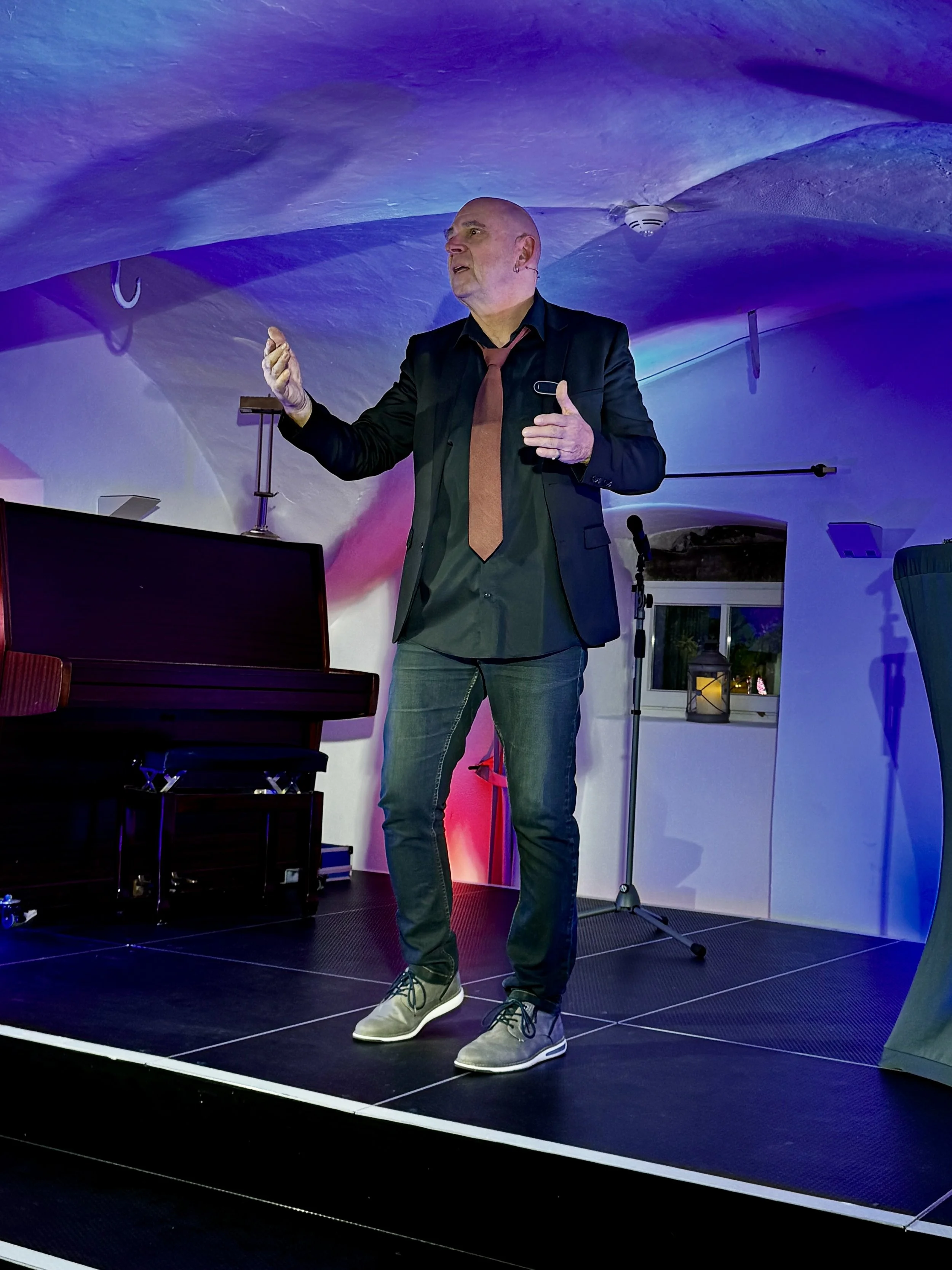 „Seit 29 Jahren sind die beiden Schuhe meine Glückbringer und bei jedem Auftritt dabei“, lächelt Jens Dreesmann. Wer einen solchen Talisman besitzt, muss sich im Grunde um seine Karriere keine Sorgen machen. So ist es jedenfalls beim Hennener Ausnahmemusiker und -sänger Jens Dreesmann. Er ist aus der Iserlohner Kulturszene einfach nicht mehr wegzudenken, seitdem er sich Mitte der 90-er Jahre entschlossen hat, Berufsmusiker zu werden. Er ist nicht nur ein charismatischer Sänger, sondern auch Chorleiter („Ohrclip“ und „Herz-Jesu-Chor“), Bandleader, Hörbuch-Sprecher und stimmgewaltiger Begleiter von Bigbands und Orchestern. Jens Dreesmann fühlt sich überall wohl – ob als Solist im Scheinwerferkegel auf einem Barhocker oder auf großer Bühne als Entertainer mit einem vielköpfigen Orchester im Rücken.