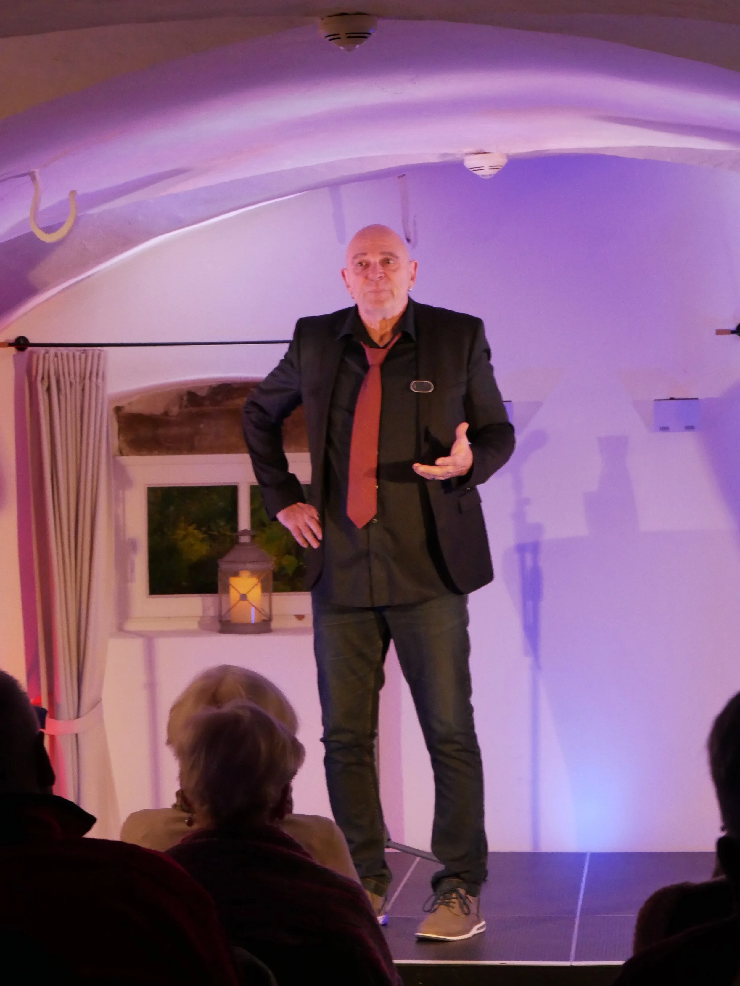 Sylvia Brécko mit Weimeraner-Hündin Audrey unterhielt die Gäste im Gewölbekeller auf humorvoll-satirische Weise. Geschichten aus dem Alltag eines Hundebesitzers gab die Künstlerin zum Besten, untermalt von einigen Gesangseinlagen. Hündin Audrey zeigte einige Kunststücke und setzte sich damit charmant und gekonnt in Szene.07. & 08. April 2025